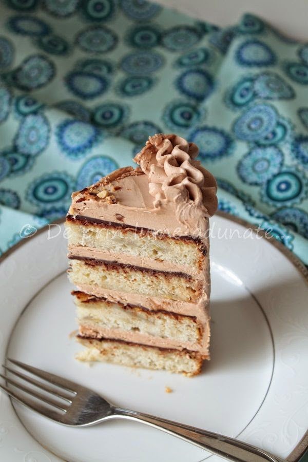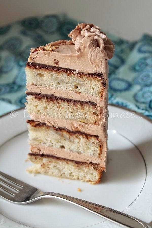 Dar sa trecem si la reteta, pentru ca pentru asta suntem aici. Daca cea mai populara combinatie solicitata pentru torturi este tortul de ciocolata cu crema de ciocolata alba si zmeura proaspata, incerc sa aduc si combinatii noi, iar combinatia de banana cu ciocolata si nutella mi-a facut cu ochiul cum am vazut-o pe Pinterest. In general romanii au o parere nu prea buna despre torturile ne-insiropate si cremele cu unt, dar tin sa contrazic asta: nu toate torturile ne-insiropate sunt uscate si fara gust. Tortul de ciocolata postat de mine pe blog este foarte moale si gustos, nu are nevoie de insiropare. Iar tortul de azi cu banana la fel. Blatul este ceva mai tare dar foarte umed si gustos. Iar despre crema de bezea elvetiana cu unt cred ca am mai vorbit: NU este unt sau shortening (ulei de palmier procesat) amestecat cu o "tona" de zahar pudra, nicicum! "Buttercream"-ul acela nu pot sa il mananc eu, cum as putea da la altii... In schimb, crema asta din albusuri batute spuma cu unt adaugat este asa de fina incat de cate ori o gust inainte sa ii adaug vreo aroma ma uimeste cat de buna este, atunci cand ii mai adaugi si nutella te duce pe taramuri ale cremelor de vis :-)