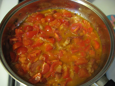 Se adauga rosiile si ardeiul iute, se potriveste de sare si piper (nu puneti multa sare, anchovies, prosciutto si caperele sunt sarate deja).