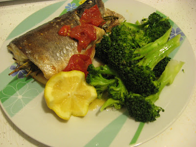 Pestele se curata de solzi, se spala, se sterge si se sareaza si pipereaza (inclusiv inauntru). Inauntrul pestelui se pun ierburile si felii de rosii, se aseaza in tava unsa cu ulei, se mai pune ulei deasupra. In tava se pun restul de felii de rosii si vinul. Feliile de lamaie se aseaza pe peste,