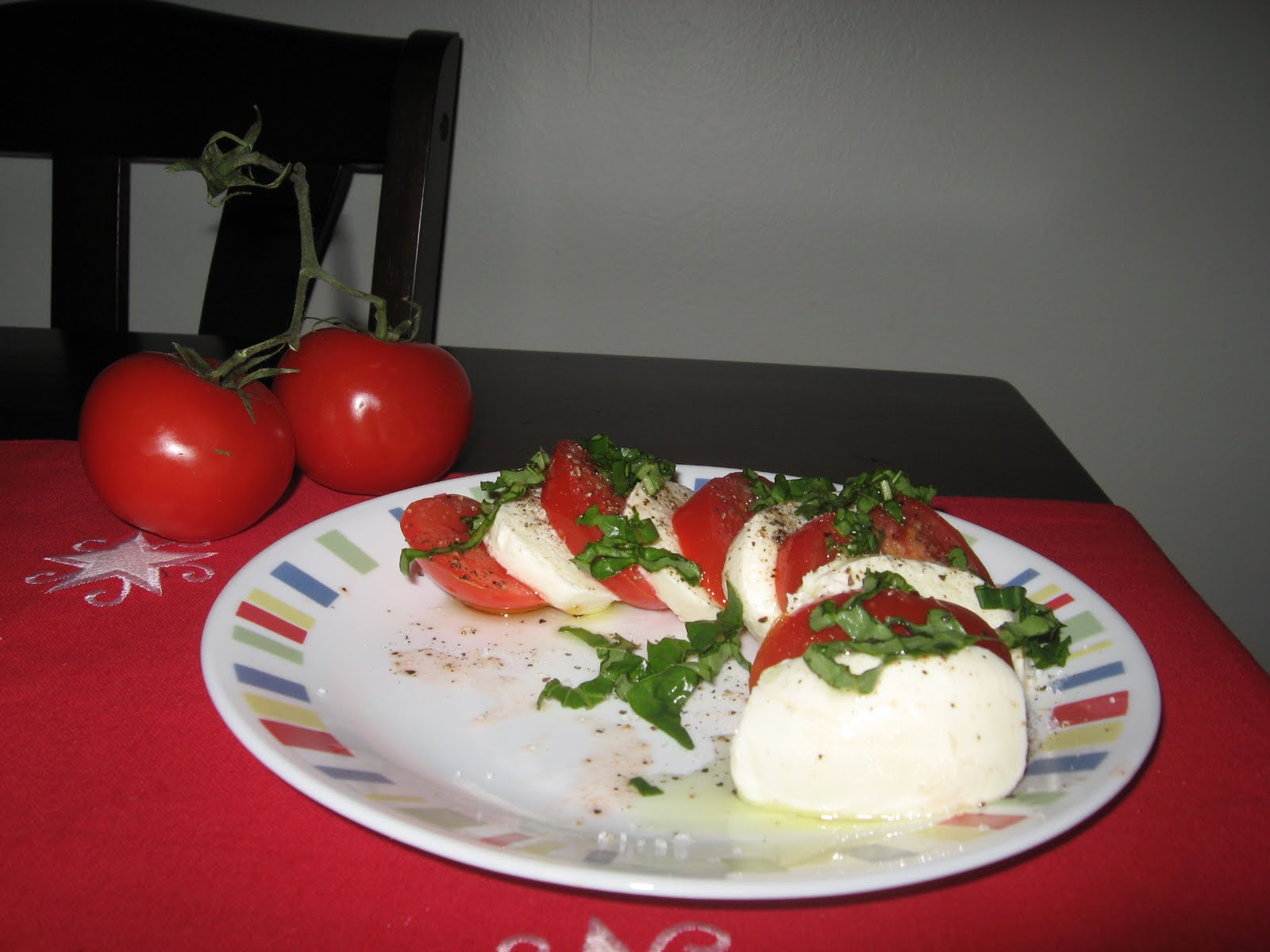 Feliile de rosii de aseaza alternativ cu cele de mozzarella, se sareaza si pipereaza, se presara busuiocul si uleiul de masline.