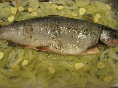 Intr-o tava se pune ceapa intr-un strat gros, usturoiul taiat feliute, foile de dafin, sare si piper, apoi se aseaza pestele, se pune si pe el sare si piper,