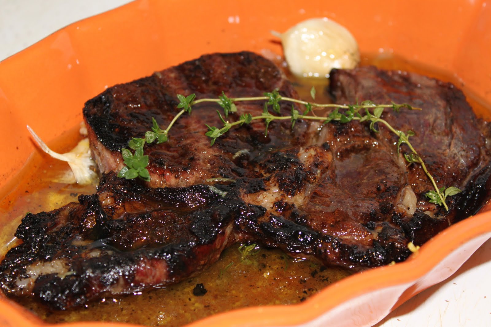 Imi place taietura "Rib-eye" (imi pare rau ca nu stiu echivalentul in romana), are mai multa grasime si va tine carnea mai frageda. Bucata mea a fost groasa de aprox 2,5 cm, si la 4 minute pe fiecare parte a fost mediu gatita, inca roz in mijloc. Daca folositi o bucata mai subtire, sau va place mai bine facuta, o tineti mai putin sau mai mult. Ideea cu saramura de dupa coacere este luata de la Nigella Lawson.