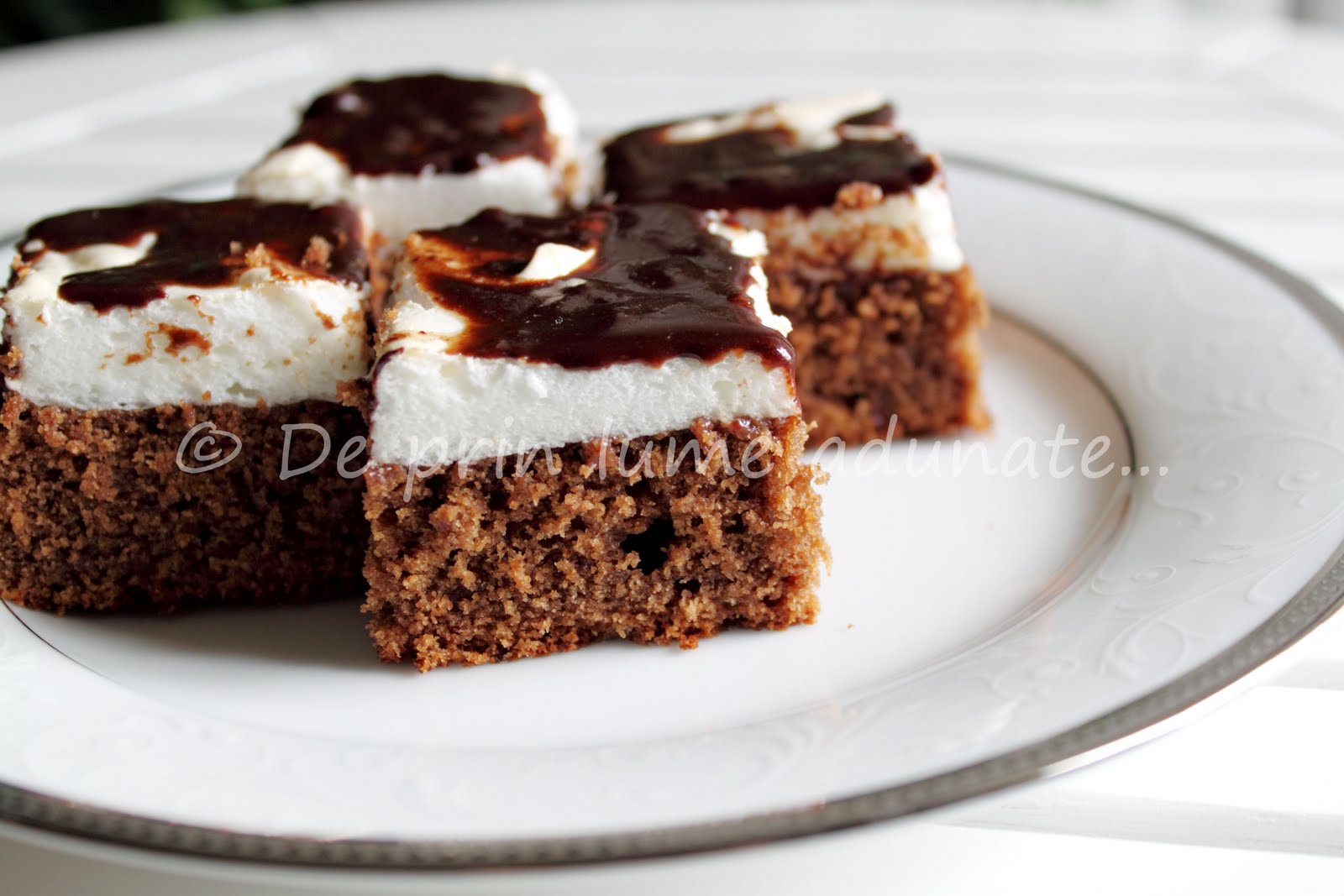 Denumita dupa contrastul dintre blatul negru, stratul alb de albusuri si siropul de ciocolata, prajitura Dinti de negru este o reteta veche, din vechiul caiet cu retete inceput de mine acum multi ani si ramas acasa la mama. Nu stiu de ce, dar, la fel ca si la prajitura Tavalita, a trebuit sa adaptez putin cantitatile, dar in final a iesit o prajitura buna si fara pretentii. Stratul pufos de albus se potriveste bine cu blatul ciocolatos, iar prajitura mi s-a parut chiar mai buna a doua zi :)