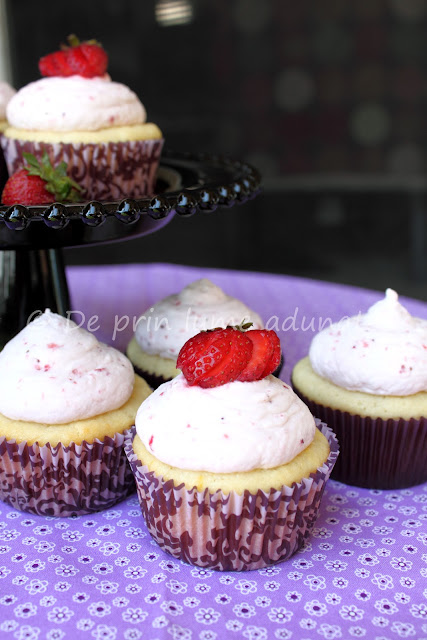 Se decoreaza cupcakes-urile folosind un pos cu forma sau o punga taiata la un colt. In cazul in care folositi forma, alegeti una cu deschidere mare pentru ca mai raman bucatele de capsuni in crema.